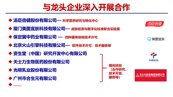 研究所進(jìn)一步加強(qiáng)高質(zhì)量科研成果轉(zhuǎn)化,構(gòu)建基礎(chǔ)研究與應(yīng)用基礎(chǔ)研究“雙循環(huán)”發(fā)展格局。在產(chǎn)業(yè)合作方面,研究所以應(yīng)用基礎(chǔ)研究為抓手,通過引入行業(yè)龍頭企業(yè),合力突破產(chǎn)業(yè)發(fā)展賽道中的關(guān)鍵技術(shù)制約,提升科技成果轉(zhuǎn)化的工程化能力,加快轉(zhuǎn)化轉(zhuǎn)移、促進(jìn)產(chǎn)業(yè)經(jīng)濟(jì)發(fā)展。包括:與湯臣倍健股份有限公司共建“科學(xué)營(yíng)養(yǎng)研究與轉(zhuǎn)化中心”;與廈門美圖宜膚科技有限公司共同設(shè)立“皮膚檢測(cè)與數(shù)字化標(biāo)準(zhǔn)實(shí)驗(yàn)中心”;與保定冀中藥業(yè)有限公司實(shí)現(xiàn)真菌毒素降解酶技術(shù)轉(zhuǎn)讓;與上海中科新生命生物科技有限公司建立“多組學(xué)技術(shù)開發(fā)與轉(zhuǎn)化中心”項(xiàng)目合作;成為商務(wù)部長(zhǎng)三角產(chǎn)業(yè)安全監(jiān)測(cè)工作站依托單位;接受上海市商委指定,作為政府第三方建立“上海產(chǎn)業(yè)安全監(jiān)測(cè)與預(yù)警研究中心”;與北京火山引擎科技有限公司、資生堂(中國(guó))研究開發(fā)中心有限公司、天士力生物醫(yī)藥股份有限公司、光明乳業(yè)股份有限公司、廣州市合生元有限公司等企業(yè)深入開展橫向項(xiàng)目合作。