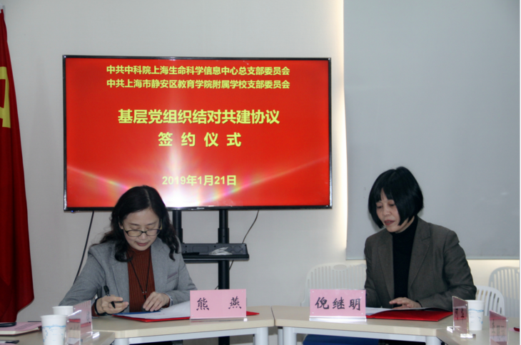 喜氣洋洋辭舊歲,滿懷憧憬迎新年。在慶祝改革開放40周年和喜迎新中國成立70周年之際,中科院上海生命科學(xué)信息中心黨總支與靜安區(qū)教育學(xué)院附屬學(xué)校黨支部黨建結(jié)對簽約儀式于1月21日上午在岳陽路319號黨支部組織生活開放點舉行,這是雙方以實際行動貫徹習(xí)近平新時代中國特色社會主義思想的具體體現(xiàn),是科研院所與基礎(chǔ)教育攜手共促黨建工作的有益嘗試。靜安區(qū)教育學(xué)院附屬學(xué)校黨支部書記倪繼明、校工會主席兼黨組織委員李明琍、校長助理兼教導(dǎo)主任逯懷海,信息中心黨總支書記熊燕、副主任繆有剛等領(lǐng)導(dǎo)出席活動。