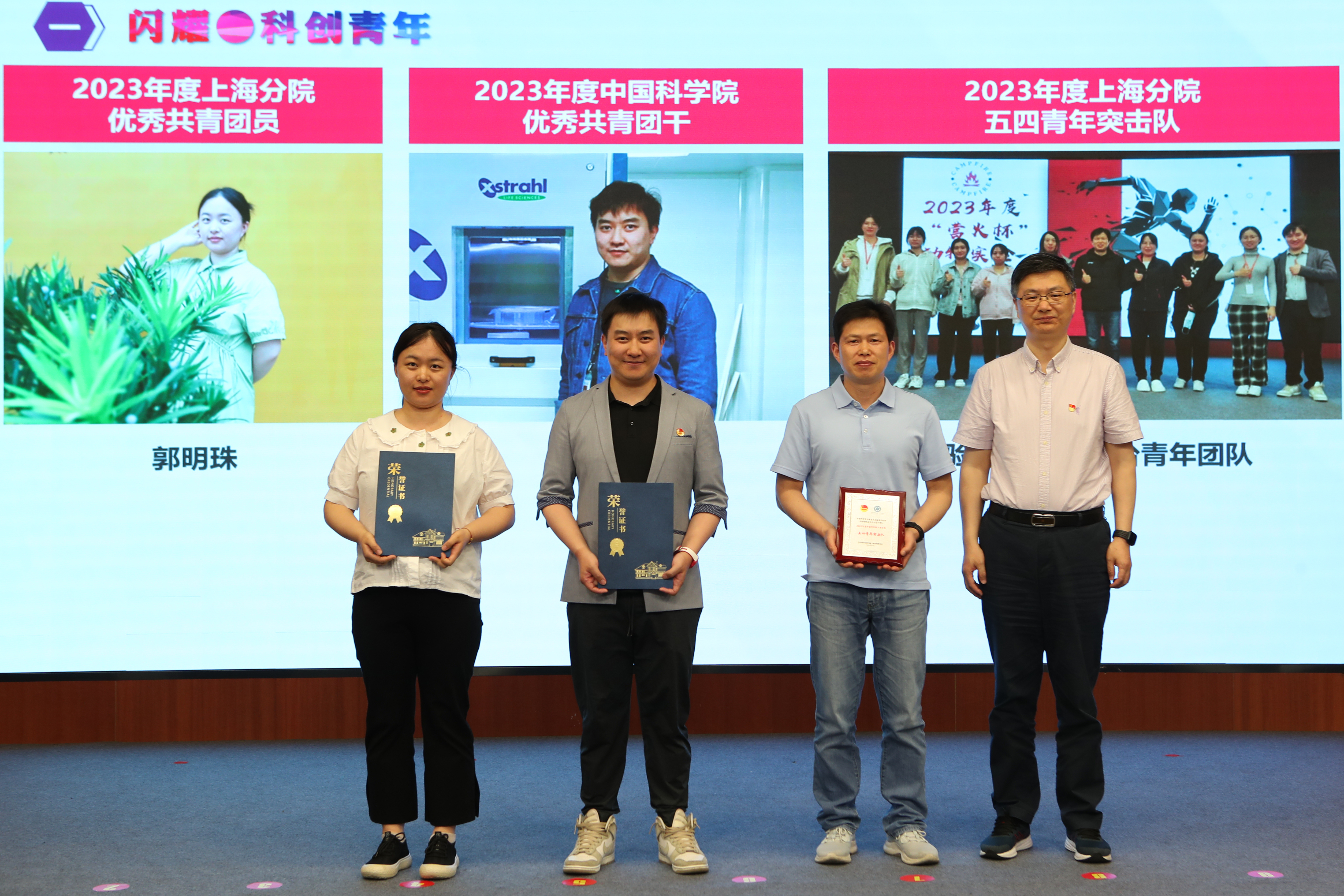 瞿榮輝為獲得“中國科學(xué)院優(yōu)秀共青團干部”、“中國科學(xué)院上海分院優(yōu)秀共青團員”、“中國科學(xué)院上海分院五四青年突擊隊”稱號的青年代表頒獎。朱泰來為獲得上海分院“中銀·科苑優(yōu)秀學(xué)子”稱號的青年代表頒獎。曹永為獲得研究所2023年度優(yōu)秀團員、團干的青年們頒獎。優(yōu)秀青年郭明珠作為代表發(fā)言。