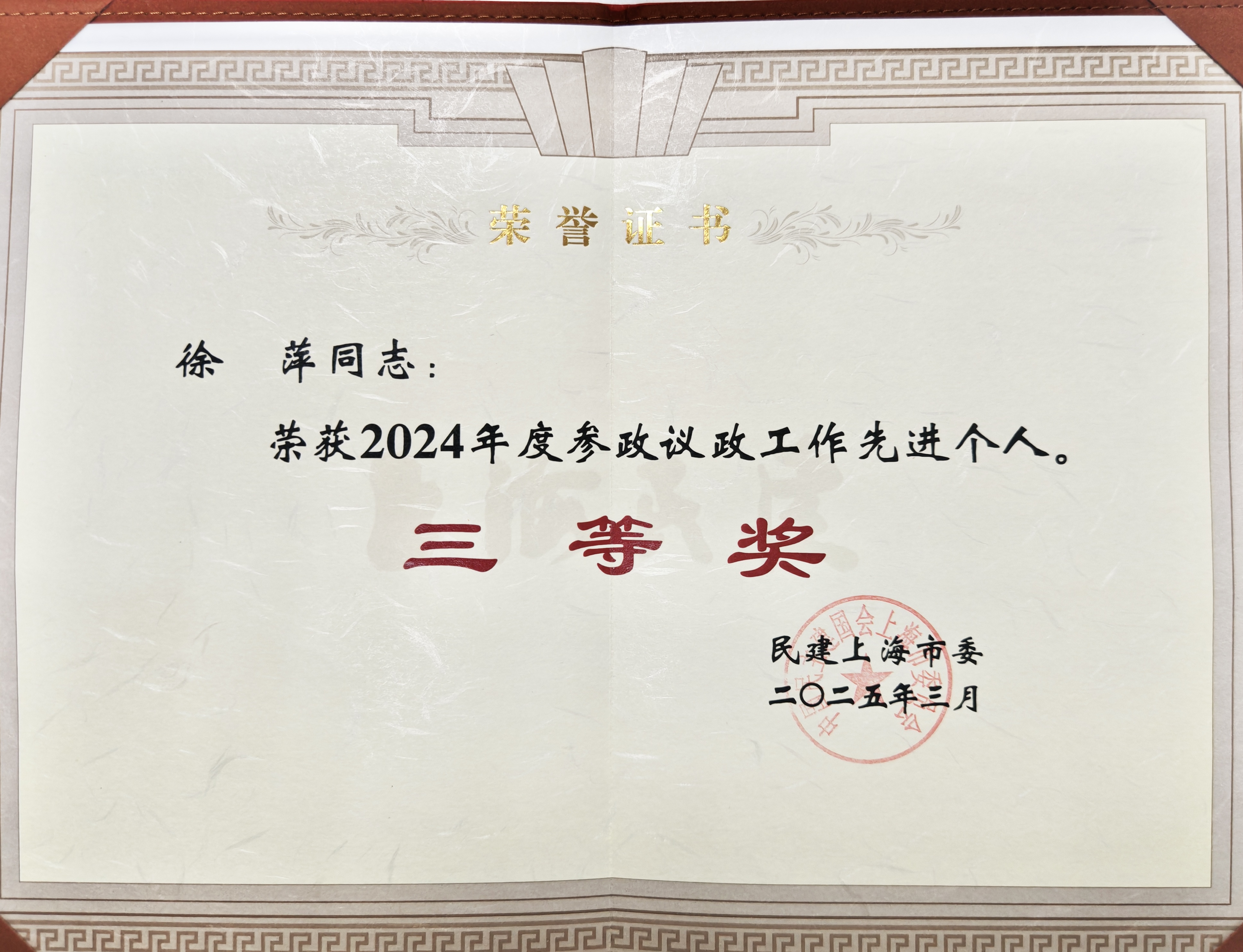 徐萍已連續(xù)多次獲得民建上海市委參政議政工作先進個人表彰,并在2024年獲得民建中央“民建組織建設工作先進個人”稱號。其撰寫的社情民意等多次被列入民建市委兩會期間的組織提案,其撰寫的社情民意信息被選作市政協(xié)民建界別提案。