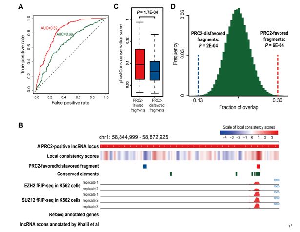 圖:PRC2結(jié)合lncRNA的序列特征在lncRNA上的分布表現(xiàn)出明顯的非隨機性, 并且這些序列特征的局域富集具有明確的功能意義