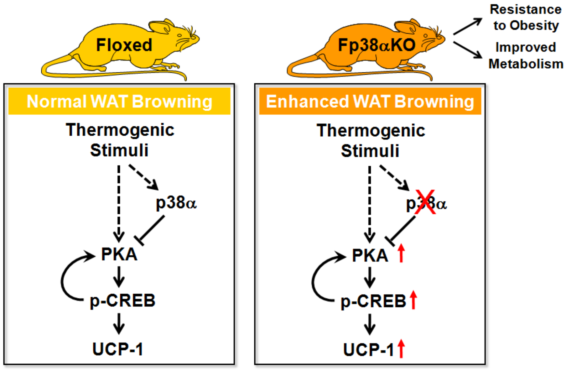 在這項(xiàng)最新的研究中,博士研究生張圣潔等人在應(yīng)浩研究員的指導(dǎo)下,發(fā)現(xiàn)脂肪組織特異敲除p38α后小鼠的體重減輕,但是體溫維持能力以及褐色脂肪產(chǎn)熱功能基本不受影響。而在低溫環(huán)境下,白色脂肪p38α缺失后能夠觀察到米色脂肪細(xì)胞比對(duì)照明顯增多,米色化活動(dòng)加劇。在β腎上腺素受體激動(dòng)劑CL316,243的刺激下,脂肪組織p38α缺失的小鼠能量消耗顯著增加。通過(guò)基因敲除小鼠和抑制劑定點(diǎn)注射兩種手段,發(fā)現(xiàn)p38α缺失或活性受損后能夠抵抗高脂飲食誘導(dǎo)的肥胖以及db/db小鼠體重的上升。通過(guò)一系列體外水平實(shí)驗(yàn),發(fā)現(xiàn)p38α缺失后在白色脂肪細(xì)胞中PKA以及CREB的活性同時(shí)上調(diào),促進(jìn)UCP1的轉(zhuǎn)錄表達(dá),細(xì)胞的米色化進(jìn)程加快,能量消耗增加。