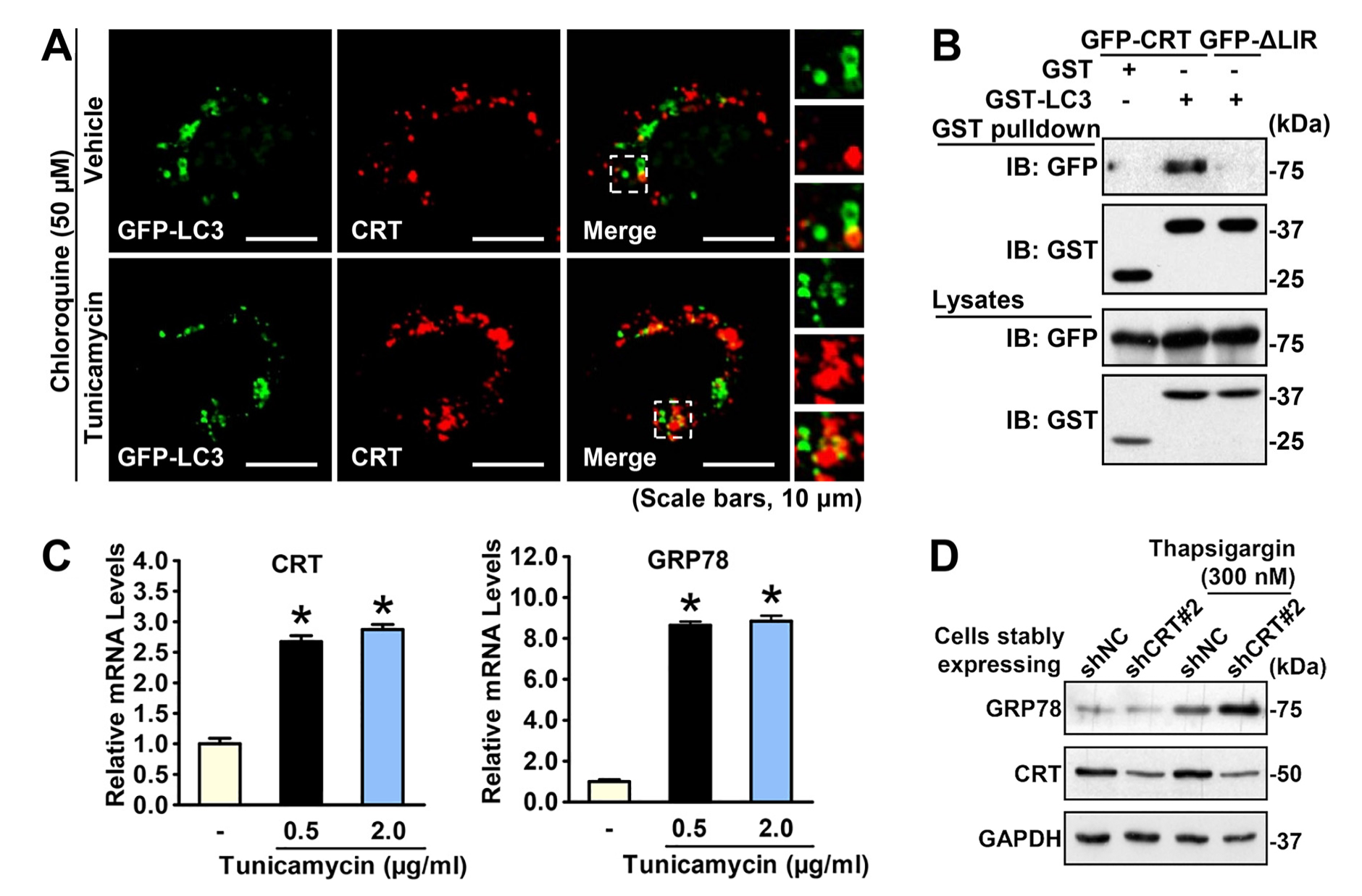 在內(nèi)質(zhì)網(wǎng)應(yīng)激(ER stress)條件下,Calreticulin受非折疊蛋白反應(yīng)(UPR)的誘導(dǎo)表達(dá)上調(diào),高表達(dá)的Calreticulin通過保守的LIR序列與自噬相關(guān)蛋白LC3相互作用,激活細(xì)胞自噬途徑,從而降解累積的異常折疊蛋白,緩解細(xì)胞應(yīng)激水平。該研究表明激活Calreticulin-自噬途徑可能會(huì)成為治療內(nèi)質(zhì)網(wǎng)應(yīng)激及相關(guān)代謝疾病的新策略和靶點(diǎn)。