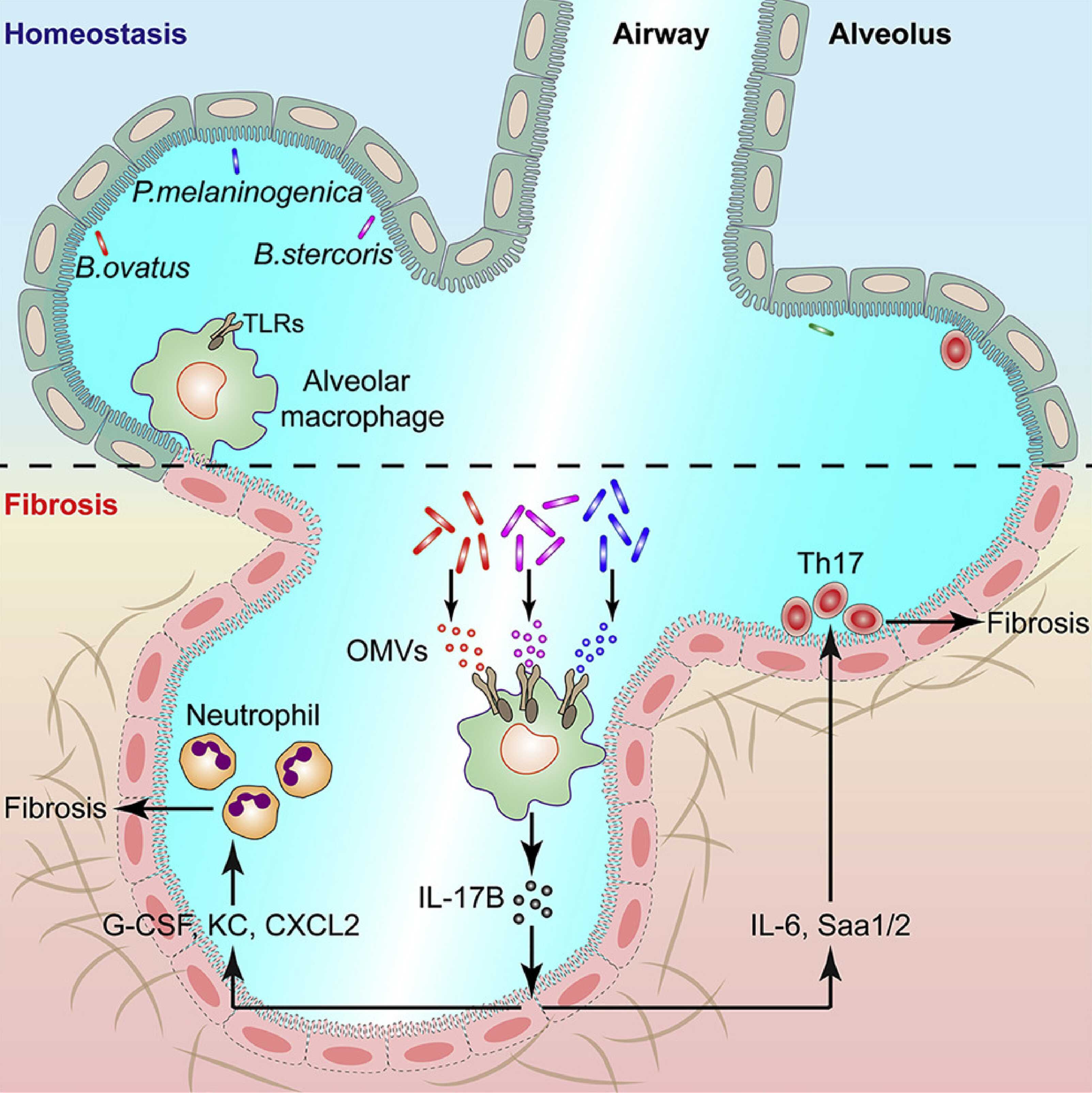 通過高通量測序等手段研究人員發(fā)現(xiàn)在正常小鼠肺組織中也存在著相對豐富的微生態(tài)菌群,而在肺纖維化病理組織中菌群發(fā)生明顯紊亂,并且紊亂的肺部菌群對肺纖維化的發(fā)生至關(guān)重要。接下來的研究發(fā)現(xiàn)肺部菌群可以通過誘導IL-17B的表達促進肺纖維化的發(fā)生??股厍宄尾烤旱男∈蟆o菌小鼠以及IL-17B缺失的小鼠都表現(xiàn)出肺纖維化減輕的表型。進一步研究鑒定發(fā)現(xiàn)Bacteroides和Prevotella兩個屬的細菌在肺纖維化過程中明顯升高,并且可以通過分泌OMVs促進IL-17B的分泌。利用骨髓移植、細胞分選等實驗手段研究發(fā)現(xiàn)IL-17B主要由肺泡巨噬細胞產(chǎn)生,并且發(fā)現(xiàn)OMVs是通過其攜帶的脂多糖和脂蛋白等成分作用于肺泡巨噬細胞的TLR2、TLR4受體激活下游Myd88介導的信號從而促進IL-17B的表達。此外,研究發(fā)現(xiàn)IL-17B可以直接作用于肺部上皮細胞誘導下游基因的表達從而促進中性粒細胞的招募以及Th17細胞的分化最終促進肺纖維化的發(fā)生。