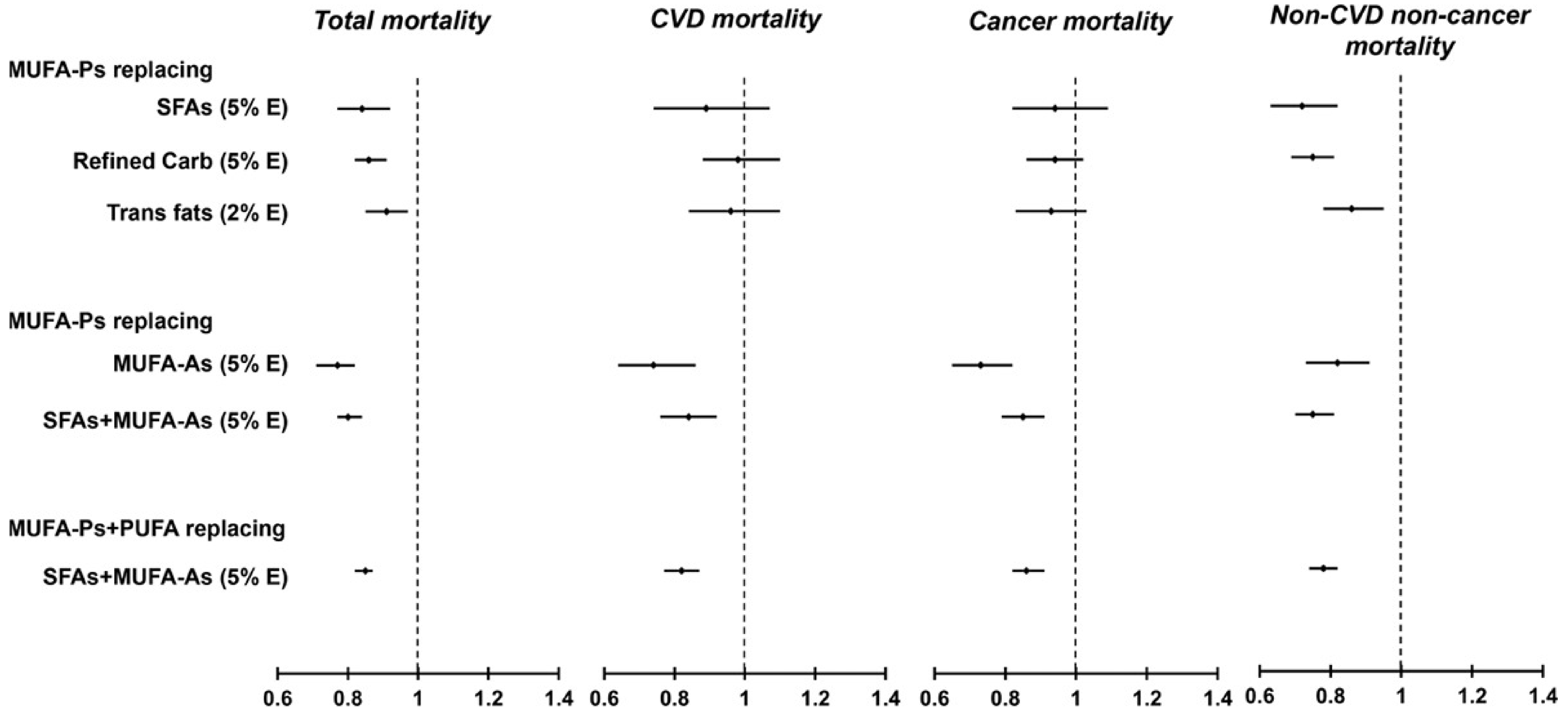 本研究納入了2個大規(guī)模的前瞻性研究隊列【護(hù)士健康研究(Nurses' Health Study)、健康醫(yī)護(hù)人員研究(Health Professionals Follow-up Study)】的近10萬名調(diào)查對象,研究人員根據(jù)每四年一次的飲食問卷(FFQ)和產(chǎn)期更新的食品成分?jǐn)?shù)據(jù)庫評估調(diào)查對象的長期膳食狀況。在22年的隨訪期內(nèi),共發(fā)現(xiàn)死亡案例20,672例。通過統(tǒng)計分析,研究人員發(fā)現(xiàn)總MUFAs和MUFA-Ps與總死亡率呈負(fù)相關(guān),而MUFA-As與總死亡率呈正相關(guān)。尤其值得引起注意的是,當(dāng)植物來源的MUFA替換相同熱量(按每日總能量攝入的5%計算)的飽和脂肪酸時,總死亡率下降16%;替換精加工的碳水化合物時,總死亡率下降14%;替換動物來源的MUFA時,總死亡率下降23%,心血管疾病死亡率下降26%,癌癥死亡率下降27%,其它死亡率下降18%(下圖)。