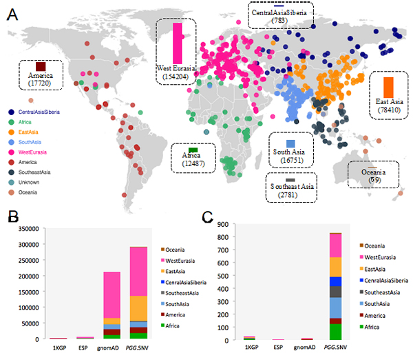 圖:PGG.SNV基因組數(shù)據(jù)的人群和地理分布概覽。
