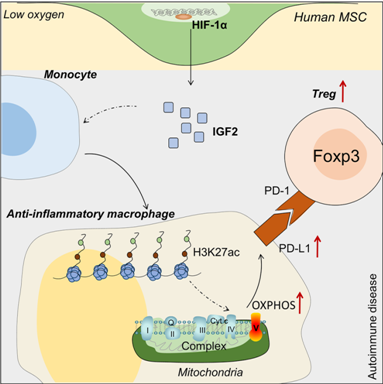 圖注:低氧培養(yǎng)下的間充質(zhì)干細(xì)胞通過分泌IGF-2對巨噬細(xì)胞進(jìn)行代謝重編程使其能夠高表達(dá)PD-L1并促進(jìn)Treg分化,以有效治療自身免疫性疾病。