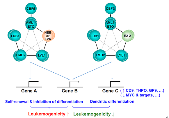 研究發(fā)現(xiàn),過表達E2-2可以特異性地抑制攜帶AML1-ETO融合基因的Kasumi-1細胞生長,并且該作用是依賴于E2-2的bHLH(basic helix-loop-helix)結構域的。對Kasumi-1細胞進行了RNA-seq和ChIP-seq的分析,發(fā)現(xiàn)E2-2能將AETFC轉移到一些新的靶基因上,激活與細胞分化相關的基因例如THPO,誘導白血病細胞向樹突狀細胞分化。在白血病患者標本中,E2-2的表達在M2b亞型中相對較低,并且E2-2的靶基因THPO的表達水平與患者的復發(fā)率存在相關性;在小鼠模型中,抑制E2-2的表達能夠加快AML1-ETO介導的白血病發(fā)生。這些結果表明E2-2可能形成一個新的AETFC亞型,通過調(diào)控AETFC異質(zhì)性從而扮演了t(8:21)白血病的負調(diào)控因子的角色。