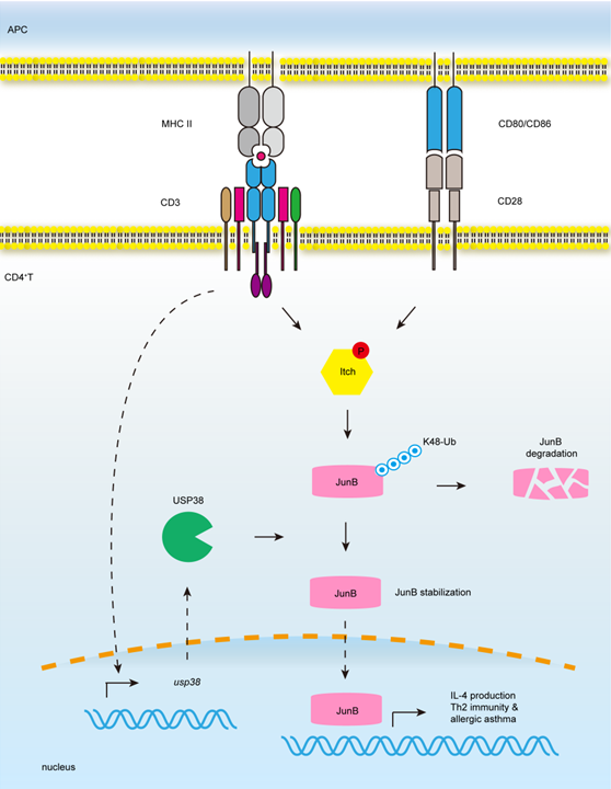 該研究首次鑒定出參與Th2細胞分化的去泛素化酶。現(xiàn)有研究發(fā)現(xiàn)TCR信號能夠通過JNK激活泛素化酶Itch的活性,從而促進JunB的降解,我們的研究發(fā)現(xiàn)Itch并不能被TCR誘導,因此,USP38的誘導能夠反作用于JNK-Itch信號,成為調(diào)節(jié)TCR下游信號事件的檢驗點,為理解2型免疫及其相關疾病提供了更為豐富的理論基礎和潛在的特異性治療靶點。