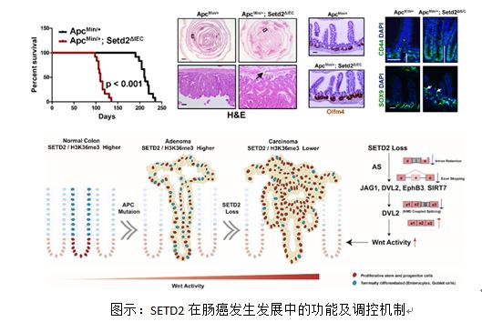 組蛋白遺傳修飾酶的異常表達或功能紊亂在腫瘤發(fā)生發(fā)展中發(fā)揮重要作用。在哺乳動物細胞中,SETD2是最主要的H3K36me3修飾酶,調(diào)節(jié)基因轉(zhuǎn)錄。研究發(fā)現(xiàn)SETD2在腫瘤組織中存在高頻突變或缺失,尤為顯著的是在腎癌中,在其他癌癥如乳腺癌、腸癌、胃腸道間質(zhì)瘤中也有報道。但目前尚未有證據(jù)闡明SETD2體內(nèi)的功能。博士研究生袁懷瑞、李霓等在秦駿研究員指導(dǎo)下,利用遺傳小鼠模型和病人數(shù)據(jù)驗證,揭示SETD2缺失可以協(xié)同Wnt信號活化促進腸癌的發(fā)生發(fā)展。在正常腸道干細胞中,Wnt信號通路被控制在合理的閾值,既維持了干細胞自我更新及增殖,同時保證腸干細胞終末分化。腫瘤中SETD2的缺失打破了Wnt信號在腸道干性維持及終末分化間的平衡,導(dǎo)致腺窩底部干細胞快速增生形成癌前組織。機制研究表明其通過影響Gene body區(qū)H3K36me3的水平,調(diào)控眾多與腫瘤相關(guān)基因RNA的選擇性拼接。SETD2的下降,造成Wnt信號關(guān)鍵調(diào)節(jié)基因DVL2的 intron retention減少,從而避免DVL2的NMD,最終過度激活Wnt信號通路,導(dǎo)致腸干細胞及前體細胞的惡性轉(zhuǎn)化。鑒于SETD2具有酶活,存在小分子藥物靶向的可能性,因此本項目的完成將可能對于腸癌的治療提供新的策略。同時SETD2調(diào)控機制的解析也將有助于我們在表觀調(diào)控層面對于腸癌發(fā)生發(fā)展進一步了解。
