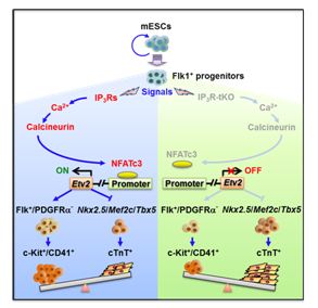 王毅潔博士和黃吉均博士等在楊黃恬研究員指導(dǎo)下發(fā)現(xiàn)ESCs自我更新和三胚層形成并不依賴于IP3Rs,然而造血中胚層(Flk1+/PDGFRa-)的出現(xiàn)依賴于IP3Rs介導(dǎo)的鈣信號(hào),這一鈣信號(hào)的缺失抑制中胚層向造血譜系分化但促進(jìn)其向心肌譜系的分化。在機(jī)制方面,IP3Rs釋放的Ca2+而非細(xì)胞外的Ca2+內(nèi)流通過激活鈣調(diào)磷酸酶(calcineurin), 進(jìn)而使得下游的NFATc3結(jié)合到調(diào)控造血發(fā)生的轉(zhuǎn)錄因子Etv2啟動(dòng)子促進(jìn)其表達(dá),進(jìn)而誘導(dǎo)造血細(xì)胞分化而防止心肌細(xì)胞分化。研究發(fā)現(xiàn)并揭示了IP3Rs在ESCs向造血和心肌這兩種具有同一胚層祖先的譜系命運(yùn)決定中的重要作用,進(jìn)一步證實(shí)Ca2+信號(hào)對(duì)于細(xì)胞命運(yùn)調(diào)控的重要性和精確性。