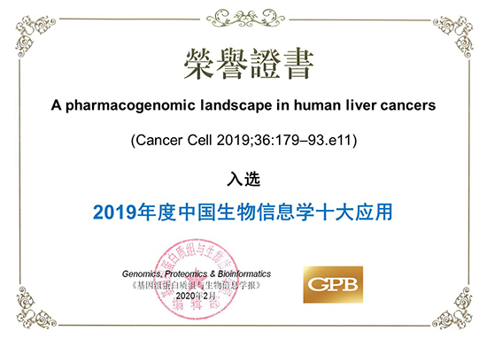 2020年2月,肝癌藥物基因組學“藍圖”,通過《基因組蛋白質(zhì)組與生物信息學報》(Genomics, Proteomics & Bioinformatics, 簡稱GPB)組織的領(lǐng)域同行專家評審,成功入選2019年度“中國生物信息學十大應(yīng)用”。該工作是由中國科學院生物化學與細胞生物學研究所惠利健團隊、中國科學院上海營養(yǎng)與健康研究所李亦學團隊、中國人民解放軍海軍軍醫(yī)大學張海斌團隊和南京大學附屬鼓樓醫(yī)院施曉雷合作完成,于2019年8月在國際頂級學術(shù)期刊Cell旗下子刊Cancer Cell上發(fā)表的研究成果。該成果構(gòu)建了目前最大的肝癌細胞模型平臺,包括50株新建立的中國病人來源的肝癌細胞系和31株發(fā)表的肝癌細胞系,重現(xiàn)了肝癌患者的基因組和轉(zhuǎn)錄組異質(zhì)性。通過整合大規(guī)模測序和高通量藥物篩選數(shù)據(jù),研究人員建立了肝癌中基因組變異與藥物響應(yīng)的相關(guān)性,發(fā)現(xiàn)了新的治療靶點和分子標志物,為索拉菲尼的個體化治療提供了循證醫(yī)學證據(jù)。