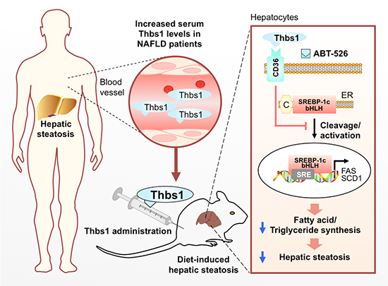 循環(huán)中的Thbs1蛋白水平隨著肝臟脂肪含量的增加而代償性增加。外源給予Thbs1蛋白可以改善飲食誘導(dǎo)的小鼠肝臟脂質(zhì)沉積,這種改善作用是通過Thbs1-CD36-SREBP-1信號軸抑制肝細(xì)胞脂質(zhì)合成途徑實現(xiàn)的。Thbs1及其多肽類似物可能是非酒精性脂肪肝的潛在治療靶標(biāo)。