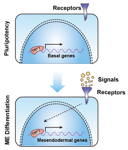 圖示:通用轉(zhuǎn)錄因子TRF3可以特異性調(diào)節(jié)hESCs向中內(nèi)胚層分化。ME: mesendoderm。