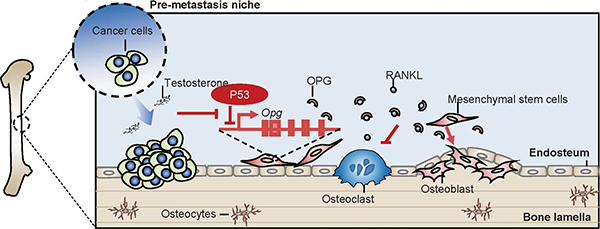 本課題研究人員利用p53基因缺陷小鼠、間充質(zhì)干細(xì)胞p53條件性缺陷小鼠,發(fā)現(xiàn)p53缺失誘發(fā)了明顯的骨密度增加現(xiàn)象;而體內(nèi)、體外實(shí)驗(yàn)證明骨密度的增加與顯著增強(qiáng)的MSCs成骨分化能力密切相關(guān)。進(jìn)一步的研究發(fā)現(xiàn),p53缺陷小鼠血漿OPG的水平明顯升高,提示p53通過(guò)調(diào)控OPG的表達(dá)影響成骨分化和骨密度。利用p53敲低和激活實(shí)驗(yàn),研究人員發(fā)現(xiàn)MSCs是OPG的主要來(lái)源之一, p53可以在轉(zhuǎn)錄水平抑制OPG的表達(dá),而高水平的OPG亦可以抑制破骨細(xì)胞的分化。骨轉(zhuǎn)移腫瘤常常誘發(fā)骨骼重塑,為研究p53缺失與腫瘤誘發(fā)骨骼重塑的關(guān)系,作者利用臨床數(shù)據(jù)發(fā)現(xiàn)OPGhip53low的基因特征與前列腺癌患者不良預(yù)后相關(guān),而前列腺癌骨轉(zhuǎn)移小鼠模型中,雄激素可以下調(diào)p53的表達(dá),并營(yíng)造高骨密度微環(huán)境。本研究的亮點(diǎn)是發(fā)現(xiàn)p53可以通過(guò)OPG調(diào)控間充質(zhì)干細(xì)胞成骨分化繼而引發(fā)骨密度改變;而在前列腺癌骨轉(zhuǎn)移中模型中,雄激素對(duì)MSCs中p53的下調(diào)和OPG的上升是導(dǎo)致腫瘤相關(guān)骨密度增加的原因之一。