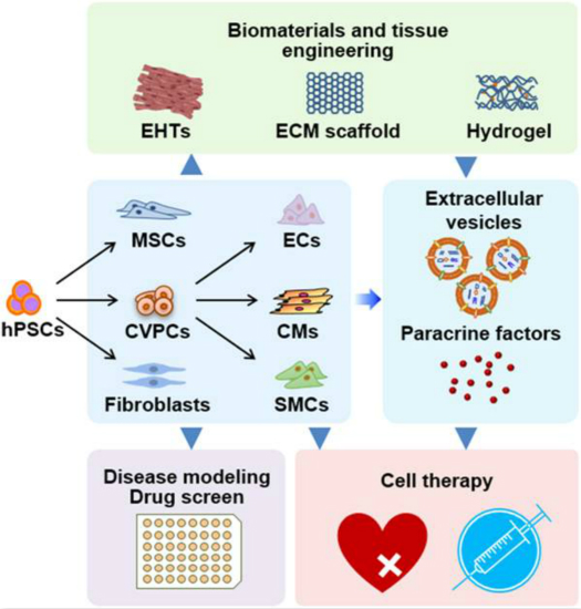 圖示:hPSC衍生心肌譜系細(xì)胞在心肌損傷修復(fù)、疾病模型、藥物研發(fā)中的應(yīng)用。