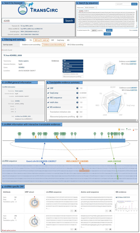 隨著測(cè)序技術(shù)的發(fā)展,目前有大量的環(huán)形RNA被鑒定出來(lái),與之不匹配的是為數(shù)不多的注釋數(shù)據(jù)庫(kù),TransCirc就是針對(duì)這一需求構(gòu)建的基于多組學(xué)證據(jù)的環(huán)狀RNA翻譯數(shù)據(jù)庫(kù)。目前,TransCirc中收錄了328080條人類(lèi)環(huán)狀RNA信息和七類(lèi)相關(guān)證據(jù),其中:1) 核糖體譜(ribosome profiling)鑒定出與核糖體結(jié)合的環(huán)狀RNA共4284條;2) 含實(shí)驗(yàn)鑒定的翻譯起始位點(diǎn)(TIS)、內(nèi)部核糖體進(jìn)入位點(diǎn)(IRES)和N-6-甲基腺苷修飾位點(diǎn)(m6A)的環(huán)狀RNA分別有10058、314111和40324條;3) 274762條環(huán)狀RNA含環(huán)狀RNA特有編碼框(ORF),其推斷翻譯產(chǎn)物中機(jī)器學(xué)習(xí)預(yù)測(cè)可形成穩(wěn)定蛋白質(zhì)和含質(zhì)譜數(shù)據(jù)(MS)直接支持的分別有194927和168條。除以上數(shù)據(jù)外,TransCirc還提供了友好的搜索/瀏覽界面及輔助分析軟件。TransCirc作為研究環(huán)狀RNA翻譯能力及其編碼肽段功能的重要資源,未來(lái)將收錄更多相關(guān)組學(xué)數(shù)據(jù)并將擴(kuò)展覆蓋到其他非人物種。
