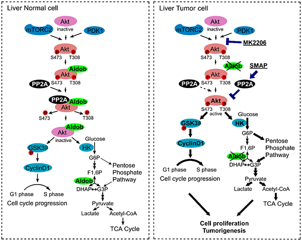 圖一. 醛縮酶B調(diào)控肝癌Akt信號通路新機制。在正常肝細胞中, Aldob除了發(fā)揮代謝酶功能外還與Akt結(jié)合, 招募蛋白磷酸酶PP2A去磷酸化p-Akt, 防止其過度激活。在肝癌腫瘤細胞中,Aldob的丟失造成Akt的激活,促進腫瘤細胞增殖與葡萄糖代謝。利用Akt的別構(gòu)抑制劑MK2206抑制Akt的酶活,或者PP2A的激活劑SMAP激活的PP2A活性均可以抑制由于Aldob丟失引起的肝癌。