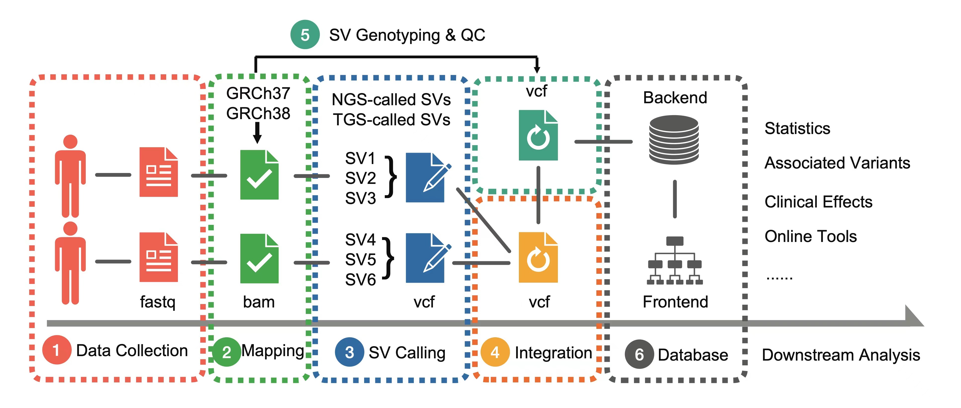 基因組結(jié)構(gòu)變異(SVs)主要包括基因組上大片段的DNA缺失、插入、片段重復(fù)等變異類型,大量研究表明SV與癌癥、自閉癥、神經(jīng)發(fā)育障礙等多種復(fù)雜遺傳病有關(guān),近年來(lái)在醫(yī)學(xué)和遺傳學(xué)領(lǐng)域中持續(xù)受到關(guān)注。隨著基因組測(cè)序技術(shù)的進(jìn)步和普及,大量的結(jié)構(gòu)變異被不斷發(fā)現(xiàn)和研究,一些具有強(qiáng)致病性的結(jié)構(gòu)變異也逐漸得到驗(yàn)證。研究團(tuán)隊(duì)旨在通過(guò)構(gòu)建一個(gè)具有代表性、多樣性的健康人群基因組結(jié)構(gòu)變異數(shù)據(jù)集,一方面為遺傳病患者的結(jié)構(gòu)變異研究提供可靠的對(duì)照樣本,另一方面對(duì)變異功能的注釋和預(yù)測(cè),也將有效縮小致病性突變的篩選范圍,為相關(guān)領(lǐng)域研究者提供有效的指導(dǎo)和幫助。