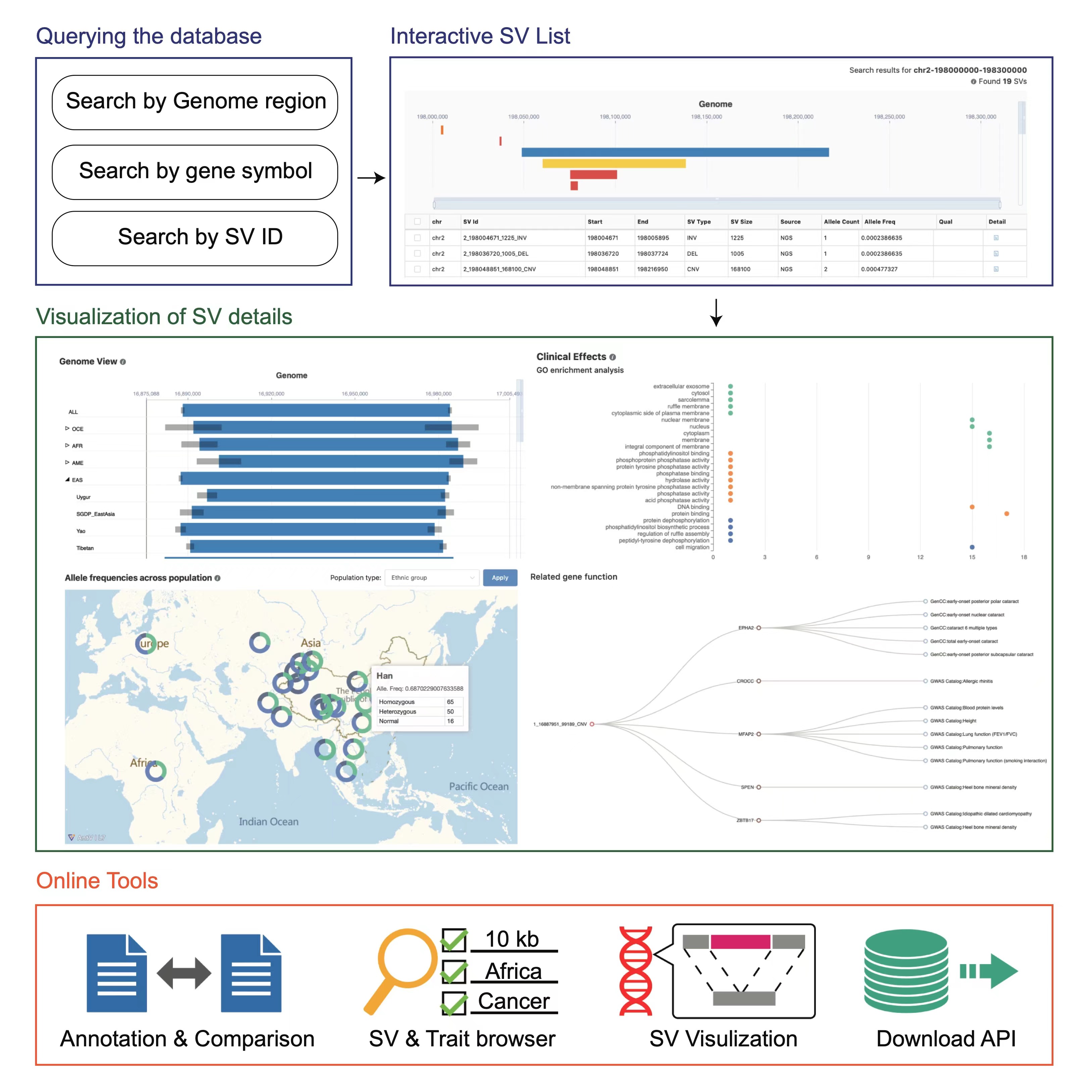 在數(shù)據(jù)庫(kù)功能上,PGG.SV提供了簡(jiǎn)潔友好的查詢功能,提供不同族群結(jié)構(gòu)變異在基因組位置上的精確展示,以及全球各個(gè)族群之間的頻率差異等統(tǒng)計(jì)信息。利用研究組先前積累的優(yōu)勢(shì),PGG.SV與徐書華教授團(tuán)隊(duì)此前開(kāi)發(fā)的PGG.SNV等數(shù)據(jù)庫(kù)進(jìn)行聯(lián)動(dòng),借助連鎖不平衡和基因組空間位置信息,將單核苷酸變異(SNV)的詳細(xì)結(jié)果與結(jié)構(gòu)變異相結(jié)合,以增強(qiáng)數(shù)據(jù)多樣性的解析功能。此外,PGG.SV提供了豐富的臨床效應(yīng)分析和預(yù)測(cè)分析功能,根據(jù)與結(jié)構(gòu)變異存在關(guān)聯(lián)的基因和調(diào)控元件,提供對(duì)其潛在表型、功能的預(yù)測(cè)和富集分析,以及由特定疾病和表型檢索相關(guān)結(jié)構(gòu)變異的工具,以便有臨床研究等需求的用戶使用。