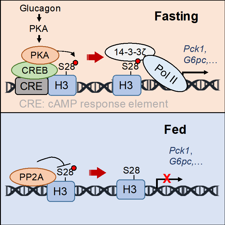 圖示. 在饑餓情況,血液內(nèi)胰高血糖素上升并與肝臟上受體結(jié)合,促進(jìn)肝臟細(xì)胞內(nèi)cAMP上升。PKA被激活并釋放出催化亞基,與基因組上的CREB結(jié)合后促進(jìn)H3S28ph。14-3-3ζ作為表觀閱讀器識別H3S28ph并招募RNA聚合酶II激活糖異生基因轉(zhuǎn)錄。相反地,PP2A是H3S28ph磷酸酶并抑制糖異生基因表達(dá)。