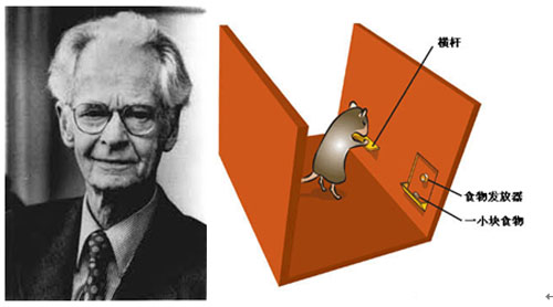 斯金納(1904—1990),美國心理學(xué)家,新行為主義心理學(xué)派的代表人物右側(cè)是其操作性條件反射行為實驗中最常用的實驗裝置。