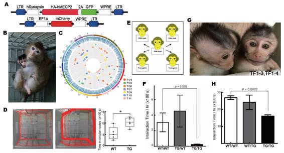 ? ? 圖4 (A)病毒載體中外源轉(zhuǎn)基因片段的設(shè)計方案。(B)在母親照看下的新生F0代轉(zhuǎn)基因食蟹猴。(C)深度測序得到的轉(zhuǎn)基因插入位點的全基因組Mapping。(D)行動路線追蹤結(jié)果示意及重復(fù)路徑時間結(jié)果統(tǒng)計。(E)社群內(nèi)社交行為檢測的行為學(xué)范式。(F)F0代配對社交行為測試的結(jié)果。(G)新生的F1代轉(zhuǎn)基因食蟹猴。(H)F1代配對社交行為測試結(jié)果。