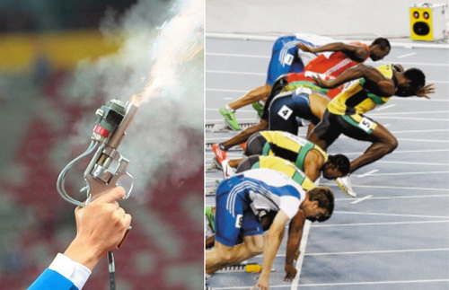 2.發(fā)令槍發(fā)出閃光,讓運動員們看到開始的信號; ???? ?
