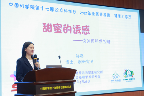孫亮副研究員在《甜蜜的誘惑——談如何科學控糖》科普報告中,著重介紹了碳水化合物的分類,膳食纖維的益處和游離糖的危害,強調(diào)了控制含糖飲料的必要性。從科學的角度指出,果汁也并非一種健康飲品,而所謂的 “0糖”食品對于健康作用的證據(jù)仍然不足。最后指出想要有健康的身體,除了關(guān)注控糖,還要均衡營養(yǎng)、控制能量攝入、積極運動等。