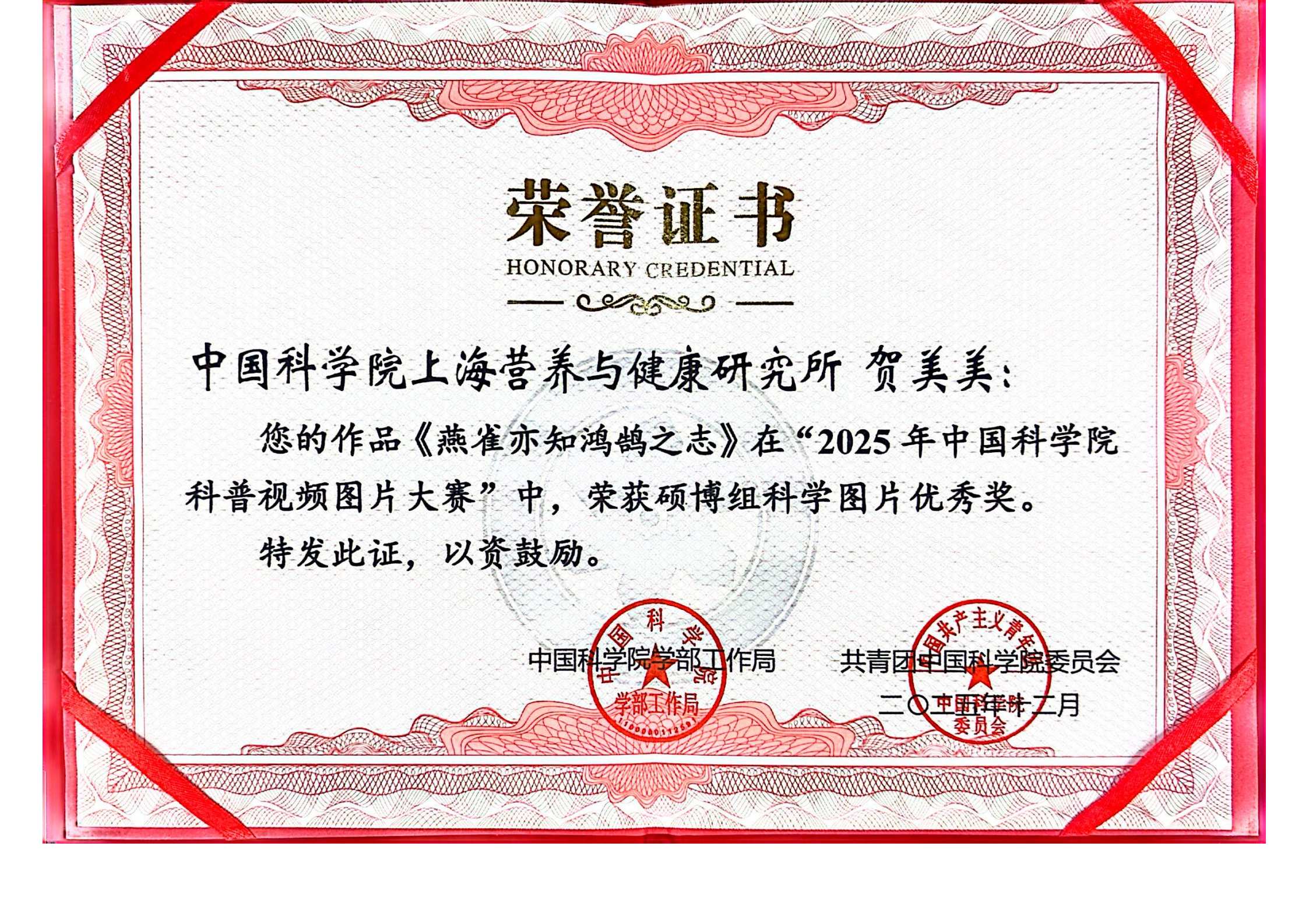 近日,2025年中國科學(xué)院科普視頻圖片大賽獲獎名單揭曉,中國科學(xué)院上海營養(yǎng)與健康研究所選送的多項科普作品斬獲佳績。其中,博士后徐盛創(chuàng)作的《小鹿與葡萄》榮獲公開組科學(xué)圖片二等獎,研究所基于錢友存研究組科研成果創(chuàng)作的《科學(xué)家首次揭示“細菌外交官” 精準(zhǔn)識菌助力腸道“免疫和平”》榮獲公開組科普視頻三等獎,研究生賀美美創(chuàng)作的《燕雀亦知鴻鵠之志》榮獲碩博組科學(xué)圖片優(yōu)秀獎。