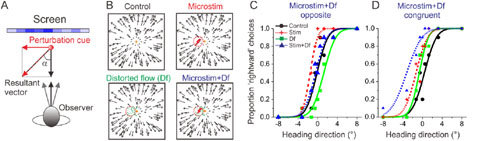 ?。?span>A)局部物體運動干擾示意圖;在觀測者自身發(fā)生運動時(黑色箭頭),局部的物體被加入額外的(物體自身)運動的向量(紅色箭頭)后,在視網膜上呈現出的合成運動向量偏移原始方向向量α度(實驗中約6度)。(B-D)電刺激與局部向量干擾對行為的交互影響;(B)四種穿插在一次實驗中的實驗條件:對照(無電刺激和局部向量干擾,左上),電刺激(右上),變形的光流場(局部向量干擾,左下),同時給電刺激和局部向量干擾(右下);(C)當同時給電刺激和視覺向量干擾時,兩者產生的效應是反向的情況(紅:在有電刺激的條件下的心理物理曲線;綠:在給局部向量干擾時的心理物理曲線;藍:同時給電刺激和局部向量干擾)。(D)當同時給電刺激和視覺向量干擾時,兩者產生的效應是同向的情況。