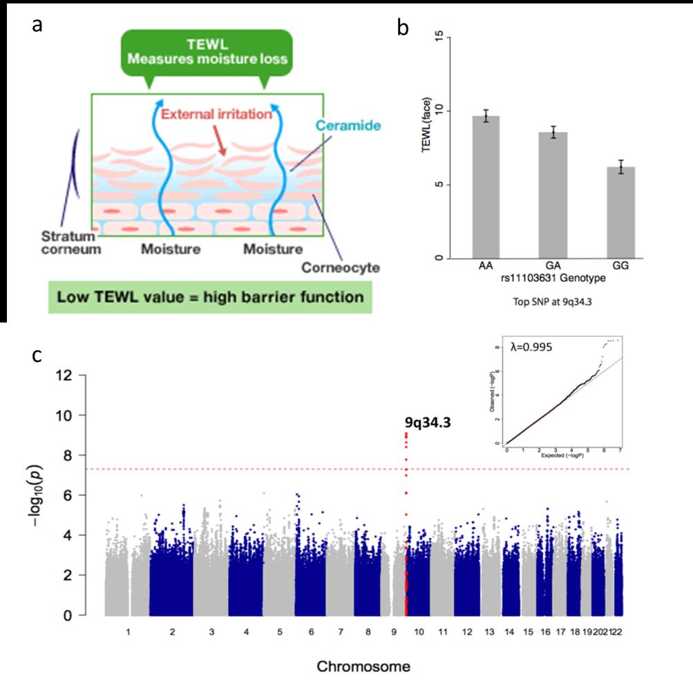 2016年12月21日,皮膚學(xué)頂級(jí)雜志Journal of Investigative Dermatology在線發(fā)表了中國(guó)科學(xué)院-馬普學(xué)會(huì)計(jì)算生物學(xué)伙伴研究所汪思佳研究組題為:“A genome-wide association study of basal transepidermal water loss (TEWL) finds variants at 9q34.3 to be associated with skin barrier function”的研究成果。經(jīng)皮失水率(TEWL),指透過(guò)表皮丟失的水分量,是評(píng)價(jià)皮膚屏障功能的重要指標(biāo)之一。該研究首次針對(duì)漢族健康人群的皮膚屏障功能,利用基礎(chǔ)經(jīng)皮失水率值進(jìn)行全基因組關(guān)聯(lián)分析,發(fā)現(xiàn)位于9號(hào)染色體9q34.3處的基因位點(diǎn)突變與TEWL密切相關(guān),揭示影響東亞漢族群體皮膚屏障功能的遺傳因素。