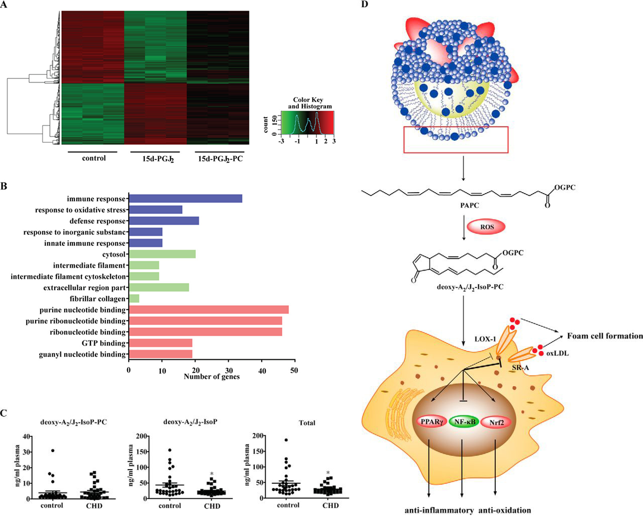 A)轉(zhuǎn)錄組學(xué)發(fā)現(xiàn)這類氧化產(chǎn)物和前列腺素15d-PGJ2影響不同基因表達(dá)。(B)氧化應(yīng)激和炎癥響應(yīng)是該氧化產(chǎn)物影響的主要途徑。(C)在心血管病人血漿中這類氧化產(chǎn)物水平降低,提示可能具有保護(hù)作用。(D)這氧化產(chǎn)物的形成和可能的作用機(jī)制。