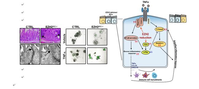 博士后劉永鋒及博士研究生孫同玉在秦駿研究員的指導(dǎo)下,通過(guò)腸道上皮細(xì)胞敲除及過(guò)表達(dá)EZH2并結(jié)合小鼠腸炎疾病模型,揭示組蛋白H3K27三甲基化轉(zhuǎn)移酶EZH2在炎癥性腸病中的保護(hù)功能。研究表明EZH2的缺失導(dǎo)致TRAF2/5表達(dá)上調(diào),從而使腸上皮細(xì)胞對(duì)TNFa更加敏感,導(dǎo)致了更強(qiáng)的炎癥反應(yīng)。調(diào)控該TNFa信號(hào)的同時(shí),EZH2的缺失解除了其對(duì)ITCH的轉(zhuǎn)錄抑制。作為c-Flip的E3連接酶,ITCH的高表達(dá)使C-Flip穩(wěn)定性顯著降低,減少了其對(duì)于Caspase 8介導(dǎo)的細(xì)胞凋亡的抑制作用,從而抑制NF-kb對(duì)于維持細(xì)胞存活的功能。該項(xiàng)工作揭示了