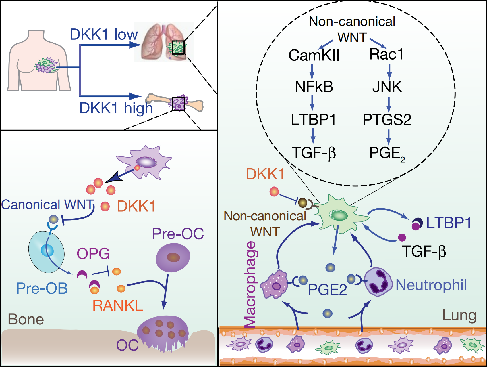 博士研究生壯雪倩在胡國宏研究員的指導(dǎo)下,發(fā)現(xiàn)腫瘤分泌的WNT信號抑制蛋白DKK1調(diào)控了癌細(xì)胞轉(zhuǎn)移時對靶器官的選擇性。DKK1高分泌的腫瘤傾向轉(zhuǎn)移到骨,而低分泌的腫瘤傾向轉(zhuǎn)移到肺。他們通過與山東大學(xué)團隊合作發(fā)現(xiàn)乳腺癌病人血清中DKK1蛋白水平可預(yù)測乳腺癌骨轉(zhuǎn)移和肺轉(zhuǎn)移的風(fēng)險。進一步的功能研究表明,DKK1在肺和骨轉(zhuǎn)移微環(huán)境中通過靶向不同細(xì)胞的不同信號通路從而發(fā)揮相反的轉(zhuǎn)移調(diào)控作用。在肺中DKK1抑制非經(jīng)典WNT通路,減少巨噬細(xì)胞和中性粒細(xì)胞的招募并同時抑制癌細(xì)胞分泌生長因子TGFβ的水平,從而抑制肺轉(zhuǎn)移。而在骨中DKK1通過抑制成骨細(xì)胞的經(jīng)典WNT信號,從而促進骨轉(zhuǎn)移形成。對腫瘤施用經(jīng)典WNT信號通路抑制劑后,肺轉(zhuǎn)移并未顯著下降而骨轉(zhuǎn)移情況惡化。相反的,聯(lián)合使用JNK和TGFβR抑制劑能夠同時抑制肺轉(zhuǎn)移和骨轉(zhuǎn)移。