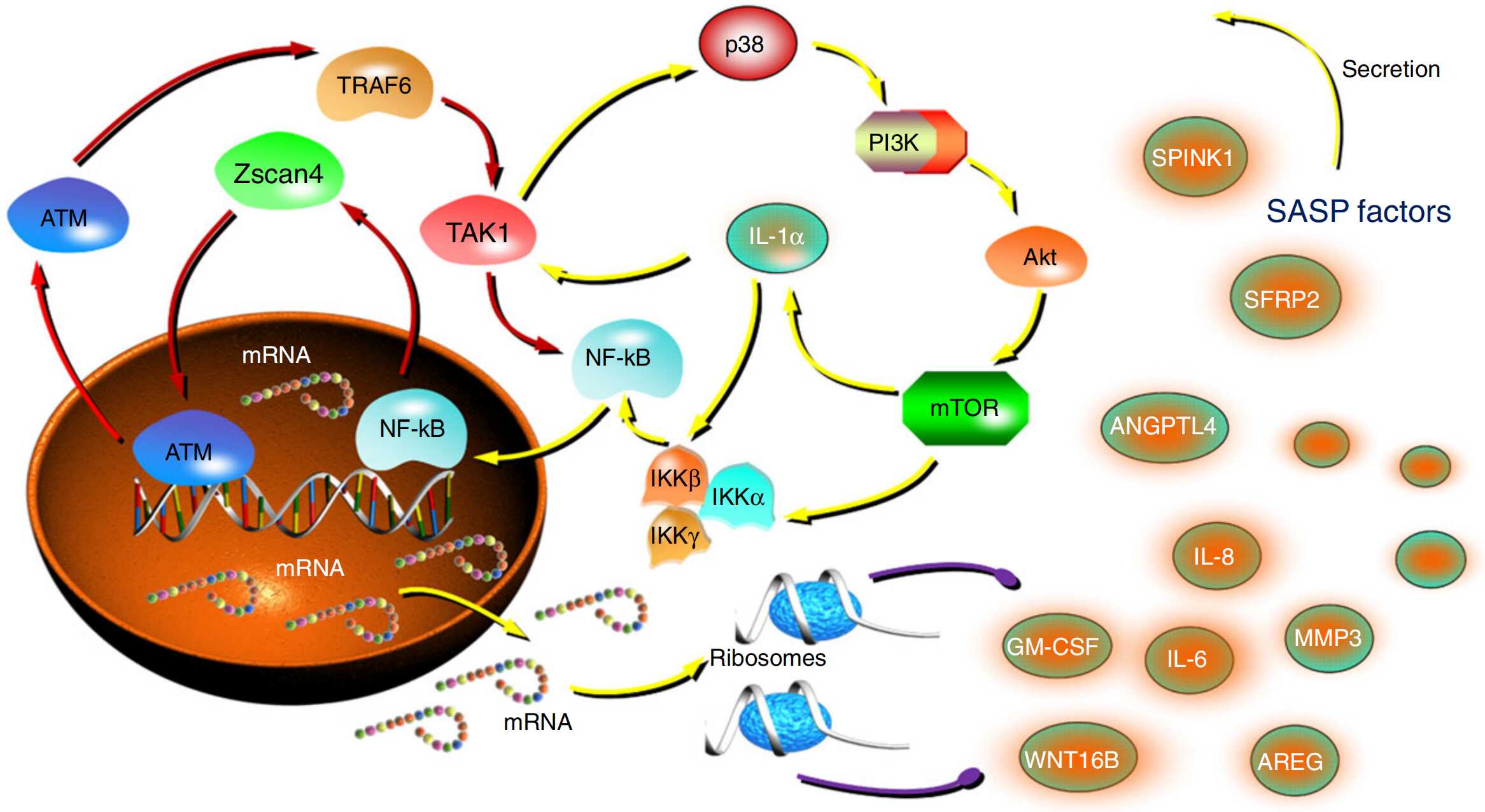 4月30日,國際學術期刊Nature Communications在線發(fā)表了中國科學院上海營養(yǎng)與健康研究院孫宇研究組題為“The senescence-associated secretory phenotype is potentiated by feedforward regulatory mechanisms involving Zscan4 and TAK1”的最新研究成果,文章報道了由藥物毒副作用引發(fā)DNA損傷效應在臨床治療過程中引發(fā)體內(nèi)細胞發(fā)生被動衰老,并在誘導衰老細胞出現(xiàn)一種強烈、持續(xù)和長期的分泌表型(senescence-associated secretory phenotype,?SASP,?衰老相關分泌表型)過程中的關鍵作用。