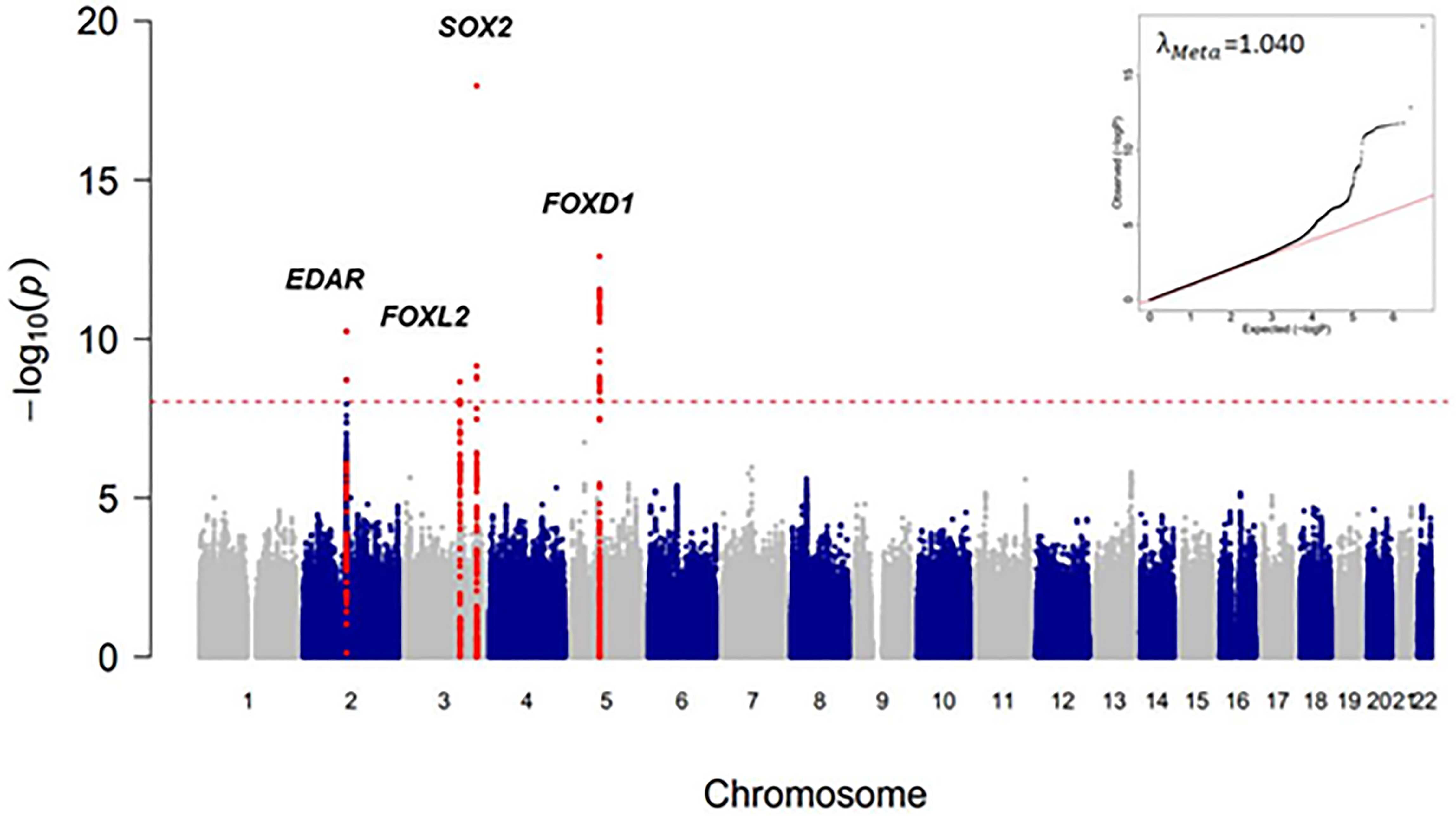 全基因組薈萃分析曼哈頓結(jié)果展示眉毛濃密度的遺傳因素