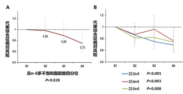 (A)與3種22碳n-6PUFA;(B)與代謝綜合征發(fā)病風險