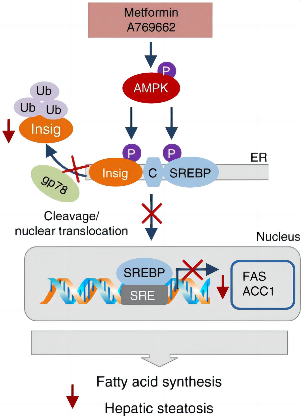 二甲雙胍、A769662等在激活A(yù)MPK的情況下,能夠磷酸化Insig-1 Thr222位點,抑制其與E3泛素連接酶gp78的相互作用,降低泛素化水平,從而增加蛋白穩(wěn)定性,抑制SREBP的剪切和活化,進一步抑制脂質(zhì)合成基因表達(dá)和肝臟脂肪酸合成,改善肝臟脂質(zhì)沉積和脂肪肝。本研究揭示了蛋白質(zhì)翻譯后修飾通過泛素化降解途徑調(diào)節(jié)脂肪酸合成的新機制,為臨床中治療非酒精性脂肪肝和相關(guān)代謝性疾病提供了新靶點和新思路。