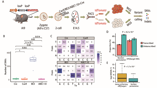 (A)實(shí)驗(yàn)流程?(B)脫靶位點(diǎn)數(shù)目比較。Cre-, Cas9-, BE3- and ABE7.10組分別有14+/-12 (SEM, n=2),?12+/-4 (SEM, n=11),?283+/-32 (SEM, n=6)和10 +/- 5 (SEM, n = 4)個(gè)SNVs?(C)突變類型的分布比較。每個(gè)格子中的數(shù)字表示該種突變類型占全部突變的比例 (D)脫靶SNVs富集在基因組中的轉(zhuǎn)錄區(qū)域?(E)Genes包含脫靶位點(diǎn)的基因在細(xì)胞胚胎中有更高的表達(dá)量。