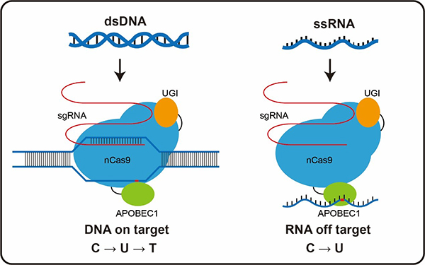 圖注.單堿基編輯器BE3中的脫氨酶除了誘導(dǎo)DNA的胞嘧啶脫氨基轉(zhuǎn)變成T,還能在RNA上造成大范圍的脫靶。