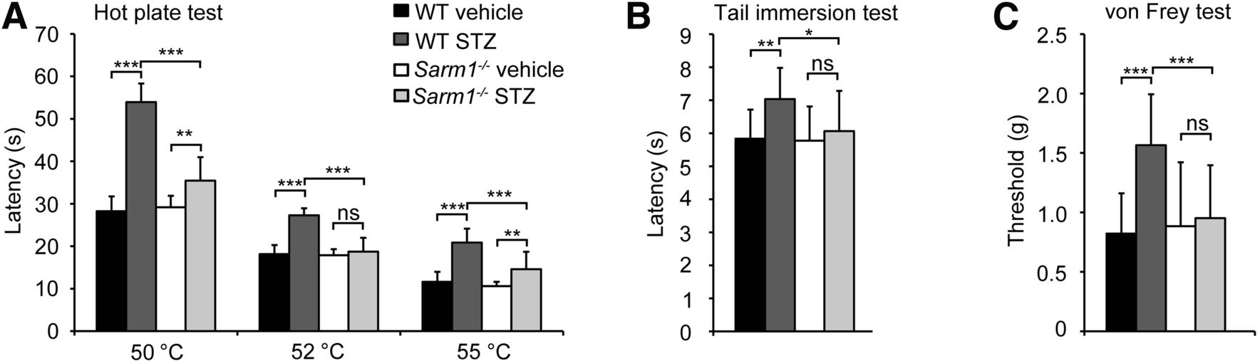 圖:Sarm1基因的敲除可以緩解糖尿病小鼠的痛覺不敏感現象