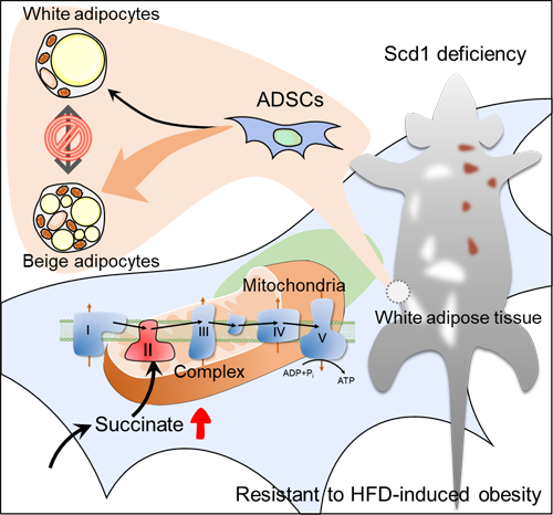 圖注:Scd1缺失導致脂肪前體細胞(ADSCs)內(nèi)琥珀酸含量升高,進而促進線粒體復合物2活性,使得ADSCs更傾向于米色脂肪細胞分化,以此導致小鼠體內(nèi)米色脂肪大量累積并抵抗高脂飲食誘導的肥胖發(fā)生。