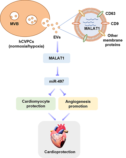 該研究利用小鼠急性心梗模型揭示,心梗急性期心肌注射hCVPC-EVs可有效促進心梗心肌的修復,hCVPC-EVs組可顯著減少心梗后心肌細胞凋亡、促進血管生成和減少纖維疤痕形成;并且低氧預處理hCVPCs可顯著提升 hCVPC-EVs的心臟保護作用。機制分析發(fā)現(xiàn)低氧預處理hCVPCs可顯著提升 hCVPC-EVs中長鏈非編碼RNA(lncRNA)MALAT1的含量,并且給予hCVPC-EVs后心肌細胞與心肌組織中的MALAT1含量顯著升高。進一步分析揭示hCVPC-EVs促進血管生成和抑制心肌細胞凋亡的作用至少部分通過MALAT1介導,其可通過與miR-497結合,抑制其表達,進而保護心肌細胞、促進內(nèi)皮細胞成管。研究發(fā)現(xiàn)揭示了hPSC-CVPCs修復心梗心肌的作用方式和新的調(diào)控機制,并提示hPSC-CVPC及其分泌的細胞外囊泡有可能用于缺血受損心臟的治療。