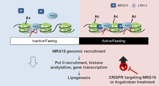 當(dāng)通過(guò)CRISPR技術(shù)在成體小鼠肝臟組織里敲除MRG15進(jìn)而抑制這一過(guò)程后,小鼠能明顯抵抗高脂飲食導(dǎo)致的肝臟脂肪積累,改善代謝平衡。更有意思的是,F(xiàn)DA批準(zhǔn)的藥物阿加曲班(argatroban)被發(fā)現(xiàn)可以高親和力結(jié)合MRG15,抑制MRG15的功能,從而有效抑制肝臟脂滴積累,提示MRG15是一個(gè)成藥性較強(qiáng)的分子靶點(diǎn)。綜上,此項(xiàng)研究揭示了肝臟細(xì)胞感應(yīng)上游營(yíng)養(yǎng)信號(hào),并在染色質(zhì)重塑水平作出及時(shí)響應(yīng)的一種傳導(dǎo)機(jī)制和其間關(guān)鍵銜接因子MRG15。