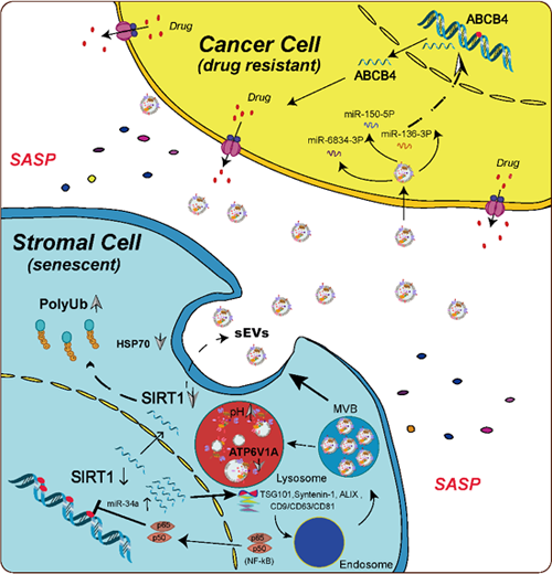研究人員發(fā)現(xiàn),同機(jī)體正常細(xì)胞相比,衰老基質(zhì)細(xì)胞釋放的小胞外囊泡數(shù)量、粒徑和分布范圍均發(fā)生深刻改變。衰老細(xì)胞中被動(dòng)激活的轉(zhuǎn)錄機(jī)器NF-κB在驅(qū)動(dòng)大量SASP因子產(chǎn)生的同時(shí),也下調(diào)了NAD+-依賴性去乙?;窼IRT1這一抗衰老蛋白的表達(dá)。伴隨SIRT1漸進(jìn)性衰退的,則是全蛋白組泛素化水平的明顯上升。與此同時(shí),多亞基液泡H+-ATPase(V-ATPase)的催化亞基A(ATP6V1A)表達(dá)降低,造成衰老細(xì)胞溶酶體酸性化(acidification)功能失衡,最終導(dǎo)致小胞外囊泡的胞內(nèi)合成與胞外釋放大幅增加。在SIRT1激活劑SRT2104(或SRT1720)的作用下,衰老基質(zhì)細(xì)胞合成胞外囊泡的能力被顯著控制。在腫瘤微環(huán)境中,衰老細(xì)胞的胞外囊泡能夠改變癌細(xì)胞的表達(dá)譜,包括以磷脂酰膽堿為底物的p-糖蛋白轉(zhuǎn)運(yùn)家族成員ABCB4表達(dá)上調(diào),而其所涉及的藥物外排泵活性隨之上升。癌細(xì)胞的這一變化促成了其自身對(duì)化療藥物的顯著抵抗,而敲除ABCB4或使用SRT2104則能有效降低衰老基質(zhì)細(xì)胞小胞外囊泡賦予微環(huán)境中癌細(xì)胞的這種獲得性耐藥的潛力。