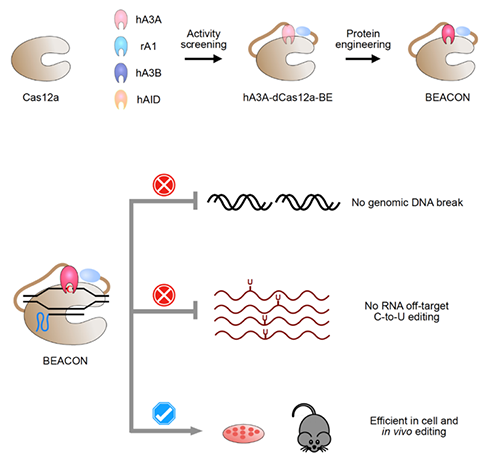 楊力研究組與上海科技大學(xué)生命學(xué)院陳佳研究組和中國科學(xué)院神經(jīng)科學(xué)研究所劉真研究組等合作報道了一類基于CRISPR/Cas12a的新型堿基編輯系統(tǒng)BEACON及其在體內(nèi)的安全應(yīng)用。相關(guān)工作以“Cas12a base editors induce efficient and specific editing with low DNA damage response”為題,于當(dāng)?shù)貢r間6月2日在國際知名學(xué)術(shù)期刊《細(xì)胞報告》(Cell Rep)發(fā)表。