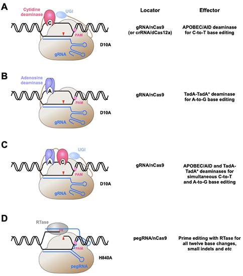 A, Cas9nickase與胞嘧啶脫氨酶結(jié)合介導(dǎo)C-to-T堿基編輯。B, Cas9 nickase與腺嘌呤脫氨酶突變體結(jié)合介導(dǎo)A-to-G堿基編輯。C, Cas9 nickase與胞嘧啶脫氨酶和腺嘌呤脫氨酶突變體結(jié)合同時介導(dǎo)C-to-T和A-to-G堿基編輯。D, Cas9 nickase與逆轉(zhuǎn)錄酶結(jié)合介導(dǎo)任意的堿基變化、小片段的堿基插入或缺失等。