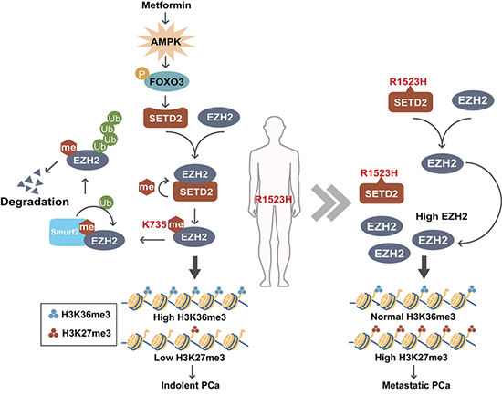 研究人員利用小鼠模型及病人數據分析,揭示SETD2的缺失顯著促進前列腺癌的遠端轉移。闡明SETD2通過對EZH2 K735位點甲基化修飾促進EZH2降解,防止細胞轉化為高H3K27me3染色質狀態(tài),進而抑制轉移性前列腺癌的形成的分子機制。EZH2缺失或K735R點突變小鼠模型表明SETD2缺失促進前列腺癌進展主要依賴于其對于EZH2甲基化修飾的調控。有趣的是,SETD2在腫瘤中存在R1523H熱點突變位點。該位點突變后可以抑制SETD2與EZH2相互作用進而缺失EZH2的K735位點甲基化修飾。因此,該突變以不改變H3K36me3修飾的方式促進腫瘤進展。此外,本研究還發(fā)現AMPK-FOXO3信號通路可以感受胞外能量變化調控SETD2的表達水平。二甲雙胍激活AMPK-FOXO3-SETD2信號軸可以抑制EZH2高表達前列腺癌的進展。