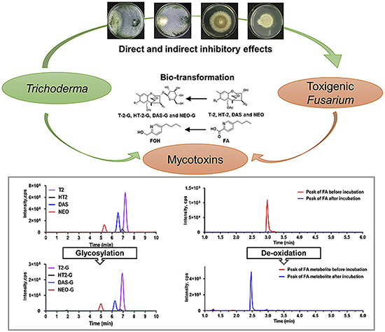 2020年9月1日,國際學術(shù)期刊Environmental Pollution在線發(fā)表了中科院上海營養(yǎng)與健康研究所武愛波研究組題為“Confrontation assays and mycotoxin treatment reveal antagonistic activities of Trichoderma and the fate of Fusarium mycotoxins in microbial interaction”的研究論文。該研究報道了生防木霉在與不同類型產(chǎn)毒真菌互作過程中,能夠通過糖基化和去氧化實現(xiàn)對不同類型真菌毒素的脫毒轉(zhuǎn)化,為發(fā)展基于木霉的真菌毒素源頭防控提出了新的路徑。同時,從毒素轉(zhuǎn)化角度探討了木霉與產(chǎn)毒真菌的互作關(guān)系,為真菌毒素污染的安全控制提供了新思路。